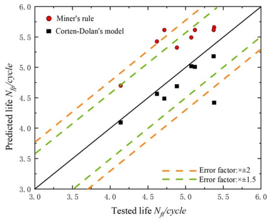 - The damage values of the variable-amplitude fatigue tests were calculated utilizing Miner and Corten–Dolan’s theories. The results showed that the DM values calculated using Miner’s theory showed a significant deviation, while the DCD values calculated by Corten–Dolan’s theory were close to 1.0 and their dispersion markedly declined. Thus, Corten–Dolan’s theory fully demonstrated its applicability to estimating the variable-amplitude fatigue life of M60 high-strength bolts;