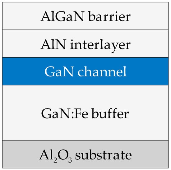A set of samples was grown on 2″ c-plane sapphire substrates by metal-organic vapor-phase epitaxy using our original in-house Dragon-125 epitaxial system with an inductively heated horizontal reactor [10,11]. The structures consisted of a low-temperature nucleation layer, a GaN:Fe buffer and an unintentionally doped GaN layer (hereafter referred to as channel layer), 1 nm AlN interlayer and 25 nm Al0.25Ga0.75N barrier. The total thickness of GaN layers was 3.4 µm. Trimethylgallium, trimethylaluminum and ammonia were used as precursors. Hydrogen, nitrogen and their mixture served as carrier gases. Ferrocene was used as a precursor to grow an Fe-doped GaN buffer layer. As we reported in our previous study [4], GaN:Fe layers remain smooth on all scales for Fe concentrations up to 1.5 × 1018 cm−3 in our growth regimes; therefore, this value was chosen in this study. The other layers were not intentionally doped. The samples were grown under the same growth conditions; the only difference between the samples was when the ferrocene flow was turned off. The sheet resistance RS, mobility μ2DEG and concentration n2DEG of the 2DEG were obtained by Hall effect measurements using the van der Pauw method at 77 K and RT.