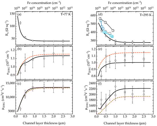 The measured sheet resistance at 77 K and RT versus GaN channel layer thickness is shown as open circles in Figure 2a,d. There is a 1.5-fold increase in RS for the structure with a 0.25 µm channel layer compared to the ones with channel layer thickness 2.5 µm at RT and an almost threefold increase at 77 K. As one can see from the rest of Figure 2, both mobility μ2DEG and concentration n2DEG decreased as the channel layer thickness decreased, resulting in increased RS. For comparison purpose, the data on RS versus Fe concentration at the barrier/channel interface of the structures with similar design from several references [8,9,31] are shown in Figure 2d. The trend is clearly visible, although our structures have lower RS, most likely due to the presence of AlN interlayer. In order to explain the observed results, numerical calculations were carried out.