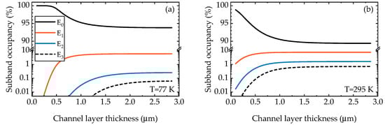 The calculated sub-band occupancies of the four lowest sub-bands at 77 K (a) and 295 K (b).
