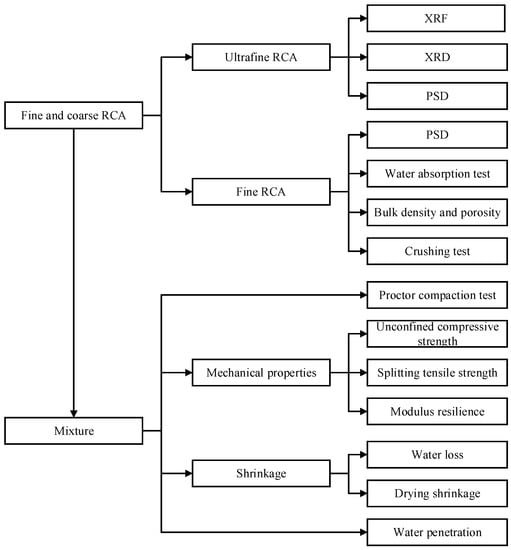 The RCA is divided into coarse, fine, and ultrafine aggregates according to different grain sizes []. Previous studies showed that the high water absorption capacity of coarse RCA was due to the high porosity of adhered mortar in RCA [,,]. According to the research, RCA with high water absorption had a significant impact on the development of mechanical and durability properties of concrete []. To date, the coarse RCA has been investigated intensively for application in road construction, replacing the natural aggregate [,]. However, the investigations about fine and ultrafine RCA focused on the chemical properties instead of the application scale []. Poon et al. [] reported that the compositions of fine RCA were old cement paste and anhydrate cement grain containing C2S and C3S, which theoretically remained reactive. However, the complex properties of fine and ultrafine RCA, particularly ultrafine RCA, remain unknown problems applying in road base course construction []. The reasons are obvious: fine and ultrafine RCA exhibit significant heterogeneity, have a high capacity to absorb water and may contain toxins as a result of the recycling process. Previous studies [,] indicated that fine and ultrafine RCA with acceptable properties could be achieved by tuning the production process and performing pre-treatments. Then the improvement in properties could be obtained. However, those improvement procedures were created with coarse RCA, and it was unclear if they could be applied to fine and ultrafine RCA [,,].