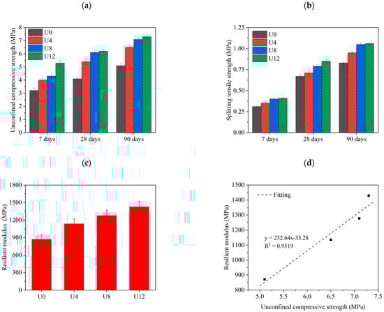 Mechanical properties (a) Unconfined compressive strength; (b) Splitting tensile strength; (c) Resilient modulus at 90 days; (d) Fitting of unconfined compressive strength vs. resilient modulus at 90 days.