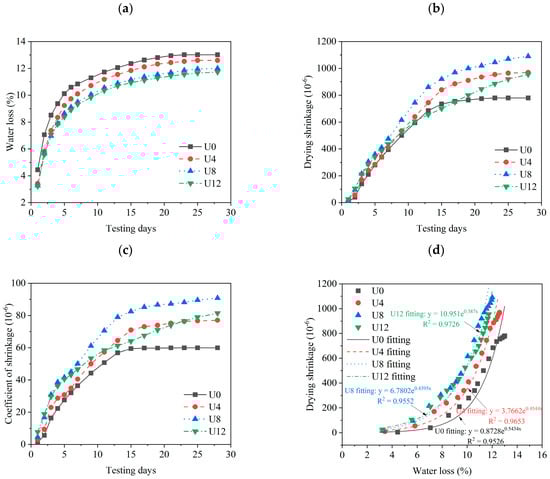 (a) Water loss; (b) Drying shrinkage; (c) Coefficient of shrinkage; (d) Relationship between water loss and drying shrinkage. U0 fitting: y = 0.8728e0.5434x, R2 = 0.9526; U4 fitting: y = 3.7662e0.4544x, R2 = 0.9653; U8 fitting: y = 6.7802e0.4395x, R2 = 0.9552; U12 fitting: y = 10.951e0.387x, R2 = 0.9726.