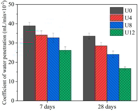 Figure 6 shows that the water penetration coefficient of samples decreases with the ultrafine RCA contents at 7 and 28 days. The coefficients of water penetration in U0, U4, U8, and U12 are 38.9, 34.1, 32.7, and 26.2 mL/(min × 10−2) at day 7, respectively. Compared to U0, the water penetration coefficients of U4, U8, and U12 decrease 12.34, 15.94, 32.65%, respectively. In addition, the coefficients of water penetration in U0, U4, U8, and U12 are 33.6, 28.5, 24.1, and 16.8 mL/(min × 10−2) at day 28, respectively. Compared to U0, the water penetration coefficients of U4, U8, and U12 decrease 15.18, 28.27, 50%, respectively. It is associated with the better particle packing of the matrix by the higher incorporation of ultrafine RCA. Meanwhile, the anhydrate cement in ultrafine RCA promotes the formation of gels, leading to a denser microstructure of the matrix [,]. It results in a lower water penetration coefficient as well. Besides, the water penetration coefficient of samples decreases with curing ages as well, which is also due to the hydration products formed from anhydrate cement in RCA. It can be seen from the results that higher ultrafine RCA contents reduce coefficients of water penetration in the late curing ages. Because the higher ultrafine RCA significantly affects the late hydration process of RCA at the late curing period in the matrix.