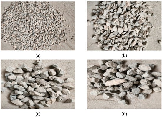 Two kinds of lithological coarse aggregates. (a) 2.36–4.75 mm limestone, (b) 4.75–9.5 mm limestone, (c) 9.5–13.2 mm basalt, and (d) 13.2–16 mm basalt.