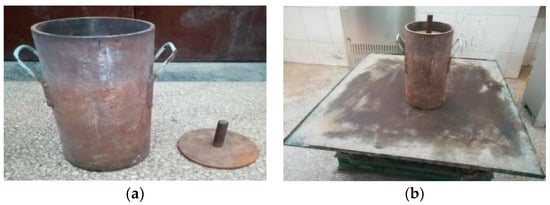 - Each mixed sample should be poured into the vessel in three parts. The amount of mixture poured for the first part was estimated according to the height of the mixture after pouring, which was about 1/3 the vessel height minus the reserved 5 cm of the top. Then, the surface was levelled, a weight stack was set in place, and the vibrating table was initiated with a frequency of 50 Hz and 2 min of compaction time. After the first compaction, the second and third pouring of mixture with the same weight as the first were, respectively, conducted in the same manner as the first.