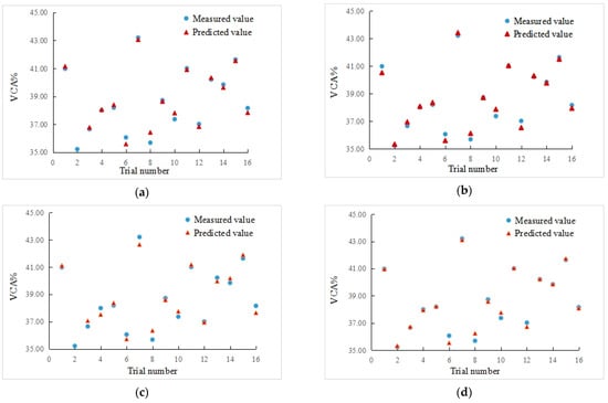 According to the above equations, there is a multivariate nonlinear relationship between VCA and the proportion of each coarse aggregate. In addition, an interaction relationship exists, with an interference effect between aggregates of adjacent particle sizes (e.g., x3, x4) and a filling effect between aggregates with large differences in particle size (e.g., x1, x4).