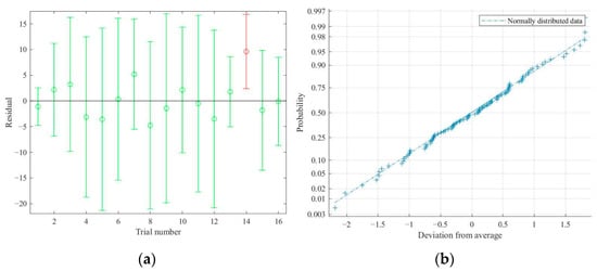 Significance testing and the comparison of average relative errors for Equation (5) were conducted in the above. To further validate the prediction equation, the residual plot and the normal probability plot were drawn by MATLAB software, shown in Figure 4.