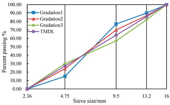 According to Table 5, the VCA values in descending order are Gradation 1 > Gradation 2 > TMDL > Gradation 3, in terms of the predicted and measured values. This indicates that the forward S-shaped grading curve has a higher VCA value, and the further the distance from the TMDL, the larger the VCA value; the reverse S-shaped gradation curve has a lower VCA value. Thus, the changing law between the shape of the hybrid lithological coarse aggregate grading curve and the VCA follows that reported in the literature [19]. It also verifies that the equation established in this paper is of general significance and can be used to predict the relative value of VCA of different mineral aggregate gradations, which is feasible and reasonable to guide the grading design of SMA with hybrid lithological aggregates.