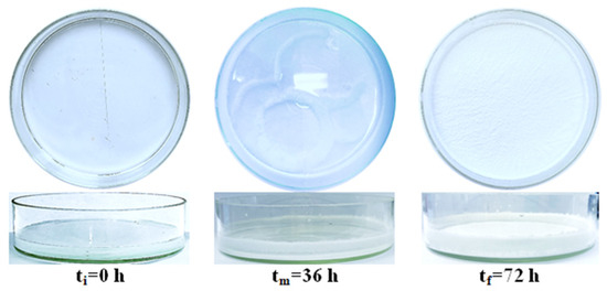Based on our previous study [22], the co-crystallization of AN with various potassium salts determined hydrogen bonds due to the polar groups with ammonium ions. This led to the inhibition of the polymorphic transformations occurring in the temperature range from −5 to + 100 °C. The duration of the co-crystallization process is strictly dependent on the volume of each sample resulting from the dissolution process. For instance, in our case, for a mixture consisting of 90 g NH4NO3, 10 g KNO3 and 200 mL of distilled water, the time required was 72 h, resulting in a final quantity of approximately 95 g of PSAN (95% yield). The co-crystallization process, at various time intervals, is illustrated in Figure 1, while the PSAN co-crystals are shown in Figure 2.