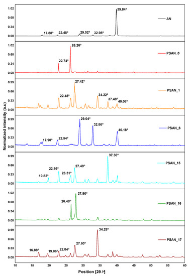 The results obtained by the XRD analysis highlighted that the stabilizing additives modified the AN crystalline structure, according to the variation of the intensity and angular positions of the peaks. The XRD profiles for the analyzed samples are given in Figure 3. Although the crystalline structure of ammonium nitrate was modified, it could not be confirmed that the phased-stabilized ammonium nitrate was in phase II [23]. Therefore, the stabilized ammonium nitrate formulations were subjected to XRD analysis to evaluate the ammonium nitrate crystals mixed with the stabilizer additive. For ammonium nitrate in pure state, the peaks appear at 17.88°, 22.48°, 29.02°, 32.98° and 39.84°. Thus, comparing the recorded data with those from the literature [23], the ammonium nitrate used in the synthesis is in phase IV, orthorhombic, of polymorphic transformation at ambient temperature [24,25]. Based on the information presented in Figure 3, it can be observed that the resulting peaks are similar, but noticeable differences appear in the case of PSAN_0 and PSAN_16, where most of the peaks are attenuated and the values for phase III vary. As for PSAN_1, PSAN_4 and PSAN_6, the variations appear mainly for phase III, where the diffraction peak values vary, at 27.42°, 27.48° and 27.60°, respectively. Although PSAN_2 contains potassium chloride, the results obtained are similar to those of AN, as confirmed by previous investigations.