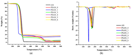 Multigraph with TGA (a) and DTG (b) thermograms for the PSAN specimens.