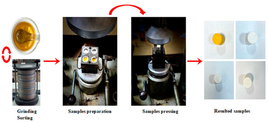 To further investigate the effectiveness of the stabilizing additives, each sample was subjected to a series of thermal cycles (as described in the Methods section). Samples of 25 g of stabilized ammonium nitrate with an average particle size of 100 μm were placed in a mold (with ϕ = 18.60 mm) and pressed using a hydraulic press. Cylindrical specimens with heights of 18.80 mm were formed, as presented in Figure 5. The compressive force applied was 15 bars.