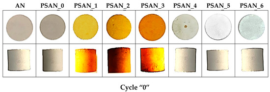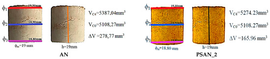 The thermal cycle investigations were conducted until noticeable cracks could be observed on the surface of the cylinders. The data collected after the heating–cooling cycles revealed that the additives with potassium in their structure were particularly successful at preventing polymorphic transitions, in the interval –5 °C–+100 °C, except for potassium dichromate (K2Cr2O7). The phase transition of the co-crystalized oxidizer inside these samples led to the appearance of imperfections in the material, producing variations in the volume of the probes. For example, in the case of a cooling phase from +100 °C to –5 °C, the volume slightly decreased when a phase transition occurred. Consequently, a crack appeared in the structure of the sample. When calculating the volume variation, an increase of 5.2% was obtained when employing neat ammonium nitrate and 4.5% for PSAN_2. An average value was established by measuring the diameter of three parallel cross-sections (ϕ1, ϕ2, ϕ3), as illustrated in Figure 6. The effects of the fourth temperature cycle on the PSAN-synthesized formulations are displayed in Figure 7.
