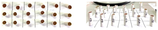 The loading density represents the ratio between the amount of the composition (m) and its volume (V). To determine this parameter, composite mixtures were cylindrically shaped, with a diameter of 15 mm and a height of 30 mm. The obtained cylinders of composite material were sized to confirm the specified diameter and height, and subsequently weighed to determine the density. The calculated values are shown in Table 5, while in Figure 8, the cylindrical configurations of the propellants from the technological process are given.