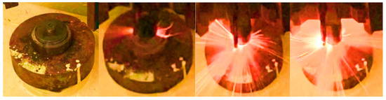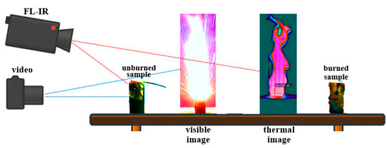 The ignition of the samples was performed with primer composition based on potassium nitrate, aluminum–magnesium alloy and binder, placed on the flat surface of the specimen, according to the setup described in Figure 10.