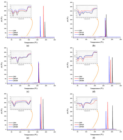 DTA thermograms of “greener” composite rocket propellants. (a) PSAN _0; (b) PSAN_1; (c) PSAN_3; (d) PSAN_4; (e) PSAN_5; (f) PSAN_6).