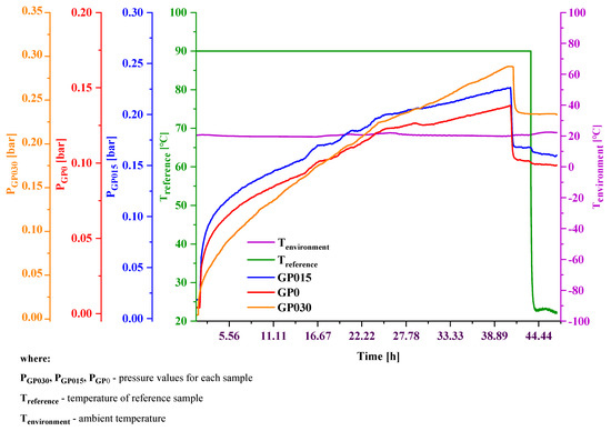 The goal of the vacuum stability analysis was to establish whether the materials utilized to manufacture the solid rocket composite propellants are chemically compatible over time. According to STANAG 4556 [19], acceptable stability is considered for a determined volume of the sample not exceeding 2 cm3/g. Values obtained for the tested mixtures are below the standard threshold value. The addition of TEGDN, an energetic plasticizer from the nitro-ester class, led to an increase in the volume of volatile gases. Even so, the obtained values are in the compliance range. The calculated results are presented in Table 11. In Figure 14 are presented the temperature profiles for rocket propellants based on PSAN_0.
