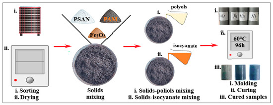 The composites employed as rocket propellants are heterogeneous mixtures comprising granular materials (oxidizers, metallic fuels and additives) embedded in a polymeric matrix. Modern rocket propellants are manufactured using cast and cure processes as they are based on polyurethane binders. In this work, a similar process was employed at the laboratory scale. The technology started with the dry mixing of the solid components (oxidizer, metallic fuel, catalyst) followed by a wet mixing with the organic components (blends of polyurethane precursors: plasticizer, MDI, SET and polyester–polyol). For this purpose, the oxidizer (PSAN) was previously granulometrically sorted and vacuum dried, then mixed with the metallic fuel and the catalyst, until complete homogenization of the solids. In the wet mixing phase, the solids were first mixed with the polyols and the energetic plasticizer, and then the aromatic diisocyanate was introduced in the final stage of the process. The wet mixtures obtained were promptly cast in cylindrical molds and allowed to cure in a vacuum oven, for 96 h, at 60 °C. The procedure described above can be better understood in conjunction with the illustrations presented in Scheme 2, while the propellant formulations are summarized in Table 2.