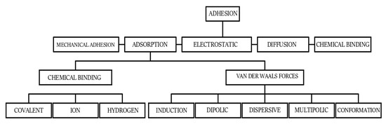 Considering all of these aspects, it seems justified to look for methods to avoid them. One such method is the use of polymeric adhesives as materials for gluing elements of facades and plinths, terraces and balconies. Their main characteristics are chemical resistance, significant adhesion to various types of substrates and non-absorbability [1,2,3]. Nevertheless, these materials also have their drawbacks. The most important one is the degradation of the polymer layer caused by the so-called aging process, associated with the gradual weakening of the chemical bonds between the molecules that make up the polymer [1,2,5,14]. This process can be accelerated by the effects of UV radiation, causing the release of free radicals from the polymer structure. In this situation, methods of modifying polymers are being sought to increase their durability [2,3,31,32]. The first group of analyses considers the possibility of improving the wettability of a substrate, such as concrete, by the polymer and its easier penetration into its rough surface during adhesive application. This is possible mainly due to the changes in wetting angle and surface free energy, which is of particular importance in the case of polymers [33,34,35]. This quantity, which is composed of a dispersive and polar component, accurately describes the bonding of the adhesive to the substrate from the point of view of the occurrence of physicochemical phenomena [35]. Most often, it is also possible to increase the peel strength from the substrate and change the modulus of elasticity. These two parameters largely determine the stiffness and, consequently, the durability of the adhesive between, for example, a stone slab and the surface to which the slab is adhering [36]. Adhesion itself is a complex phenomenon that does not have a homogeneous definition. The models shown in Figure 1 are the types of adhesion accepted and described in the literature [15,18].