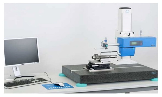 Measurements were conducted for the cutouts obtained from the corresponding concrete surface. Each slice had dimensions of 5 × 5 cm. The operation of the profilometer consists of conducting 48 measurements through the movement of a needle in contact with the surface of the test specimen. The change in the position of the needle attached to the holder with the possibility of movement in the direction of the vertical axis is converted into electrical signals and, owing to a special module of the device, processed into an image of the tested surface. With the aid of the described device, it is possible to make a 2D and 3D profilogram. The measurement was carried out on 5 × 5 cm sections of the surface. As a result, a complete database of each surface and its roughness is obtained along with its image. The test stand is shown in Figure 2.
