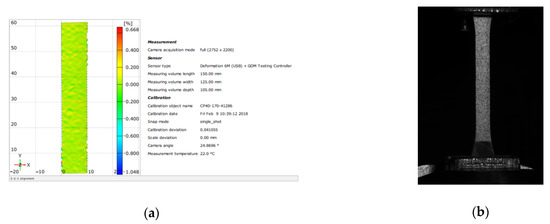 The tensile strength, modulus of elasticity and Poisson’s ratio of the adhesives were determined on 4 mm thick paddle-shaped specimens (Figure 3) [58,59]. For each series, six measurements were conducted using an MTS 810 strength tester (MTS Systems, Eden Prairie, MI, USA) with electronic recording with an attachment with a load range of up to 5 kN. A displacement control of 1 mm/min was used. The tool supporting the reading of axial tensile strength and the modulus of elasticity was a special ARAMIS system (Gom a Zeiss Company, Oberkochen, Germany). ARAMIS software enables one to conduct this type of analysis by using a non-contact, three-dimensional strain measurement and a 2D and 3D image analysis method. This measurement is made possible by locating changes in the position of points on the surface of the sample obtained by applying a special contrast-based pattern to the sample (Figure 3). A camera with very high resolution and sensitivity captures the first image, which serves as a comparison level for subsequent images in which individual points change their position during the test. During the described tests, the number of pictures taken is 500/min. The corresponding counting module then performs a comparative analysis of pixel position changes in successive photos. If the input data are given, i.e., the thickness of the specimen and the speed of change of the press piston displacement, it is possible to obtain the complete results of the strength parameters with their corresponding graphical presentation (Figure 3). All tests were carried out 14 days after the samples were molded and the resins hardened.