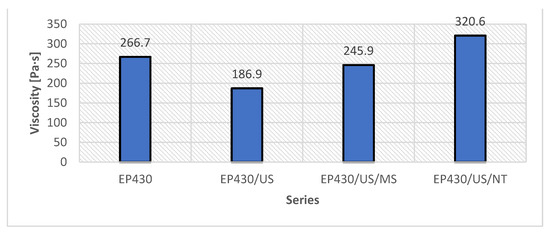 The viscosity values of the adhesive when the sonicator was turned off, compared to the viscosity of the unmodified adhesive, are shown in Figure 5. In turn, Figure 6 shows the viscosity values after the adhesives cooled to 22 °C. No change in density was noted for any batch, which reached an average value of 2.05 g/cm3.