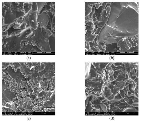 In the final stage of the conducted research, the structure of samples extracted from the surface of resins was analyzed using a scanning electron microscope (SEM)—Quanta 250 FEG (FEI, Hillsboro, OR, USA). The microscope is equipped with a LaB6 cathode electron gun, which, based on spectroscopy methods, enables one to obtain a very accurate image of the sample under study. The analysis was performed under high vacuum conditions. The samples were attached with carbon tape to aluminum holders before testing. The carbon electrically conductive layer, about 50 nm thick, was obtained via a sputtering process in a Quorum Q150T sputtering machine (Quorumtech, Laughton, UK). The test was carried out under secondary electron (SE) light, with an accelerating voltage in the range of 10−15 keV.
