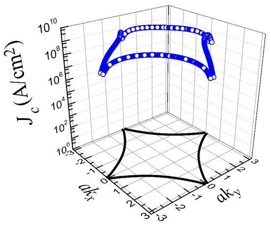 The discovery of superconductors with high critical temperatures by Bednorz and Müller [10], generally behaving as Type-II superconductors, i.e., exhibiting a mixed state where any magnetic field greater than but lower than (the superconducting to normal transition field) can penetrate the material in the form of vortices (fluxons), came to be the beginning of anisotropic superconductivity. This means that these materials do not have a constant or isotropic superconducting gap [6,11], such as in the BCS theory, but it depends on the wave vector () of the electrons that form the Cooper pairs. Therefore, although physical properties such as the critical current density in the superconductor state have been studied in the context of anisotropy, these studies mostly rely on the arguments of well-known mesoscopic or macroscopic approaches, with no consensus at the microscopic level. On the one hand, with mesoscopic approaches, we refer to fundamental approaches based on the laurate Ginzburg Landau theory, which, in brief [12], gives an account of the vortex dynamics in type II superconductors at a scale comparable to the superconducting coherence length , i.e., comparable to the radius of each one of the fluxons. On the other hand, at lengths much greater than , with macroscopic approaches, we mean those based on the ansatz of Bean’s model [13], where the current density is simply constrained by a threshold value or critical current density . This simple but elegant ansatz might be the first time that has been formally established as a universal parameter characterizing the practical functioning of type-II superconductors, serving as the base for building more general formulations of what today is called the critical state theory and related power law approaches [14,15,16], where Maxwell equations for the superconducting state can be solved for large-scale applications such as motors, generators, fault current limiters, etc. [17,18,19,20,21].