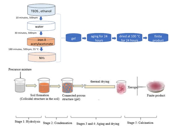 Following previous work [19], SiO2FexOy xerogel is synthesized using the sol-gel method, using tetraethyl-orthosilicate-TEOS, Si (OC2H5)4, (SigmaAldrich) (7 mL) as silica precursors and iron (II) acetylacetonate, C10H14FeO4, Fe(acac)2 (SigmaAldrich, Burlington, MA, USA) (0.54 g) as iron oxide precursors. The TEOS is dissolved in 37.2 mL of ethanol (Chimopar, SC CHIMOPAR TRADING SRL, Bucharest, Romania) and stirred for 10 min at 500 rpm using a magnetic stirrer (DLAB MS-HS); then, 13.8 mL of deionised water is added and stirred for 30 more minutes. Iron (II) acetylacetonate is also added, stirring mechanically for 3 h and maintaining a temperature of 55 °C in the solution. Gels are formed when NH3 (Chimopar, SC CHIMOPAR TRADING SRL) (0.46 g) is used as catalyst, with the pH becoming 10. Obtained material is left for 24 h to age at room temperature and then dried in an oven (POL-EKO SLW53, Poland) at 100 °C for 24 h.