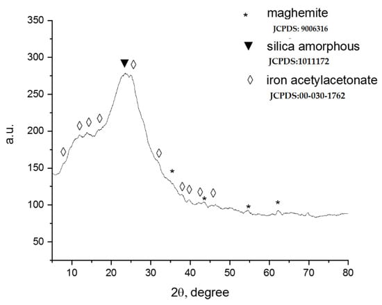 The XRD diffractogram of the synthesized material shown in Figure 2 generally indicates an amorphous aspect of the sample. The diffraction lines specific to SiO2 observed at 20–30 2θ overlap with those specific to Fe(acac)2. Detailed analysis of the recorded spectrum also shows the appearance of diffraction lines at 35, 43, 57, 63 2θ, specific to the formation of γ-Fe2O3 but in a very small amount. According to Scherrer’s calculation, it was found that the γ-Fe2O3 particles were an average size of 20 nm.