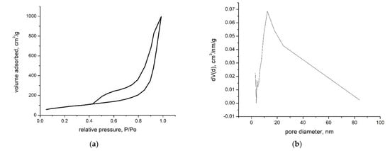 In Figure 3a, the adsorption–desorption isotherm of the composite material, SiO2FexOy, is presented, and Figure 3b shows the pore size distribution obtained using BJH (Barrett, Joyner and Halenda) method from the desorption branch.