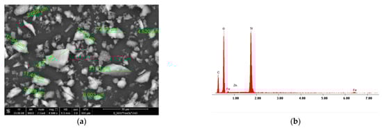 From the image presented in Figure 4a, it can be observed that the prepared adsorbent materials have a low degree of crystallinity, with several crystals with dimensions between 2 and 20 μm. Moreover, from the EDX spectrum presented in Figure 4b, we can observe that the prepared material has the expected composition.