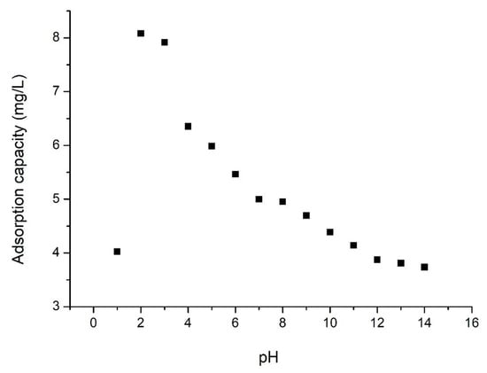 From data presented in Figure 6, we can conclude that the highest adsorption capacity was obtained when the adsorption process was conducted at pH = 2 (~8 mg/g) [29].