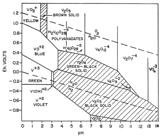 Relationship between the state of vanadium in aqueous solution and vanadium concentration and pH [30].