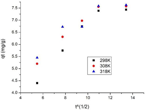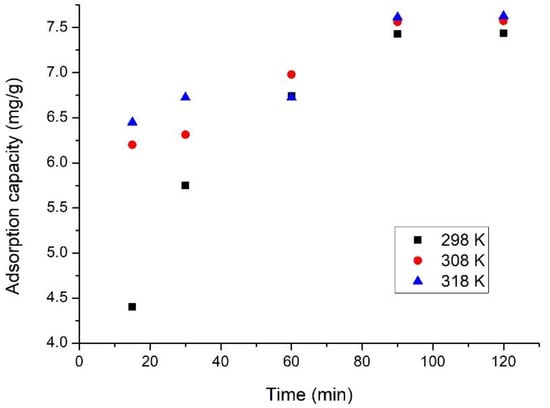 Data presented in Figure 8 indicate that with the increase of the contact time, the adsorption capacity of SiO2FexOy material increases, up to 90 min. After a period of more than 90 min, the adsorption capacity of the material remains approximately constant (~7.5 mg V (V)/g of adsorbent material), leading us to the conclusion that a contact time of more than 90 min is not required. This behaviour of the adsorbent material can be explained only by considering that the adsorption process is mainly controlled by the inner surface diffusion of vanadium ions (V). Adsorption of vanadium ions from aqueous solution can be considered a long process, until the adsorption equilibrium is reached due to the adsorption of vanadium ions onto the porous material, controlled mainly by an inner surface diffusion process, being much slower than the bulk diffusion [32].