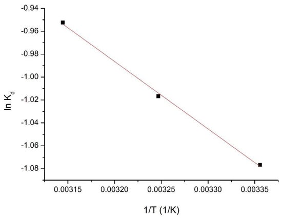 Thermodynamic studies were performed in the temperature domain between 298 to 318 K. Figure 12 shows the dependence ln Kd = f (1/T).