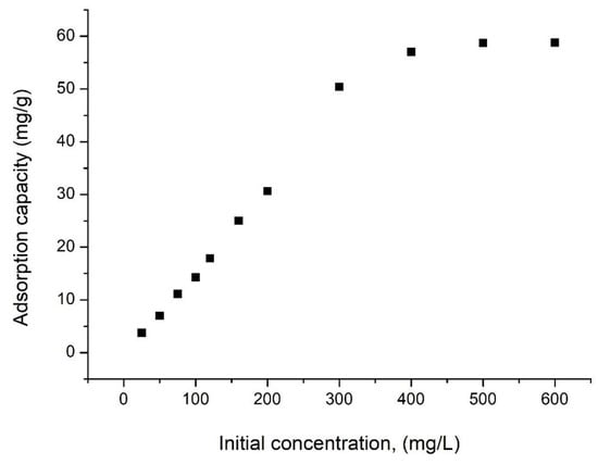 The effect of the initial concentration of V2O5 on the adsorption capacity of the material is shown in Figure 13.