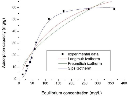 Analysing data presented in Table 6, we can observe that the studied adsorption process is well-described by the Sips model, as the regression coefficient obtained in this case, R2, is closest to 1 (R2 = 0.9914).