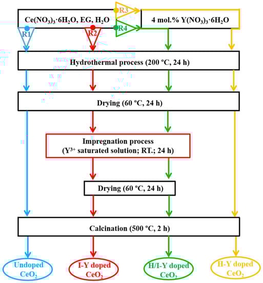A flow chart of the synthesis procedures employed for the undoped and Y-doped CeO2 samples is shown in Figure 1. The reference CeO2 without Pr-doping was prepared by the hydrothermal process using Route 1 (R1), as shown in Figure 1, denoted as Undoped CeO2. The CeO2 samples doped with Pr cations during only the impregnation process or the hydrothermal process were synthesized as shown in Route 2 (R2) and Route 3 (R3) of Figure 1, denoted as I-Y-doped CeO2 and H-Y-doped CeO2, respectively, while the one doped during both the impregnation and hydrothermal processes was synthesized as shown in Route 4 (R4) of Figure 1, denoted as H/I-Y-doped CeO2.