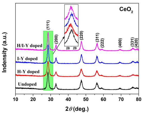 XRD was employed to characterize the phase composition of the as-synthesized undoped and Y-doped samples. Figure 2 shows the XRD patterns of the Undoped CeO2 and H-Y-, I-Y-, and H/I-Y-doped CeO2 powders. For the XRD pattern of the Undoped CeO2, eight well-resolved peaks were observed, which could be indexed to the (111), (200), (220), (311), (222), (400), (331), and (420) planes of cubic CeO2 (JCPDS no. 34-0394; fluorite). No additional phases were detected, suggesting pure CeO2 had been obtained by the hydrothermal process using route R1 in Figure 1. After the introduction of Y cations in the synthesis process, the XRD patterns of the H-Y-, I-Y-, and H/I-Y-doped CeO2 samples exhibited a similar profile to that of the Undoped CeO2. However, no peaks for impurity phases such as Y2O3 were detected, which could be explained as follows: the impurities in Y-doped CeO2 samples might exist as highly dispersed or amorphous surface species, or the amount of the Y impurity was low. Another possibility is that the Y cations partially substituted the Ce ions to form a solid solution. The inset in Figure 2 shows that the (111) reflection shifts toward lower 2θ values with the incorporation of Y ions, and it can be found that the shift exhibited by the H-Y-doped CeO2 sample was the greatest. Moreover, the lattice parameters of CeO2 were estimated using Bragg’s equation and summarized in Table 1. It was found that the calculated lattice parameters for H-Y- (5.4242 Å), I-Y- (5.4190 Å), and H/I-Y-doped (5.4227 Å) CeO2 were greater than that of the undoped sample (5.4117 Å). These findings implied that the large Y ions (1.02 Å) partially substituted the Ce4+ ions (0.97 Å [32]) to form a CeO2-based solid solution while holding the cubic fluorite structure of CeO2.