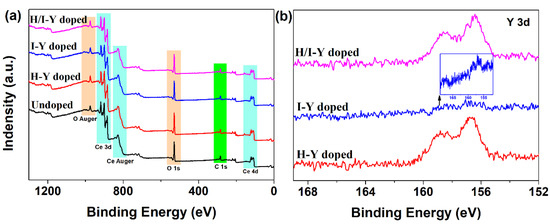 In order to probe the possibility of the presence of the Y element in CeO2, as well as the chemical state of its presence, XPS was employed to study the Undoped CeO2 and Y-doped CeO2. Figure 3a shows the wide-scan XPS spectra of the Undoped CeO2 and H-Y-, I-Y-, and H/I-Y-doped CeO2 powders. As observed in Figure 3a, the XPS profiles of all the samples were similar, dominated by the signals of Ce, O, and C elements, in accordance with a previous report for pure and Y-doped CeO2 [33]. However, there was no sign of the Y element at first sight from the wide-scan XPS spectra of the H-Y-, I-Y-, and H/I-Y-doped CeO2. To ascertain whether the CeO2 contained the Y cations and the Y-doping was real, the corresponding Y 3d XPS regions of the H-Y-, I-Y-, and H/I-Y-doped CeO2 were recorded. For the Y 3d XPS regions of the H-Y- and H/I-Y-doped CeO2, we could cleanly identify the Y 3d signal and its unique contour, which is assigned to the trivalent Y ions. However, the Y signal was weak from the Y 3d XPS regions of the I-Y-doped CeO2, yet its signal peak of Y 3d could still be identified in graphing alone (inset in Figure 3b).