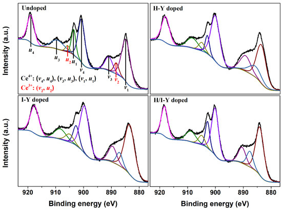 In order to understand the effect of Y-doping on Ce ions in CeO2 crystals, the Ce 3d XPS regions of the Undoped CeO2 and H-Y-, I-Y-, and H/I-Y-doped CeO2 were recorded and fitted, as shown in Figure 4. The Ce 3d core-level XPS of all CeO2 samples could be fitted into eight peaks, referring to the 3d5/2 and 3d3/2 spin-orbit doublet of Ce cations (including Ce3+ and Ce4+ ions). The bonds labeled as v2 and u2 belong to the spin-doublet term of the Ce3+ state, and the bands labeled as v4, v3, and v1 (and those for u) are due to the case of the Ce4+ state [34]. A quantitative analysis of the concentration of Ce3+ ions based on the measured Ce 3d XPS spectra, labeled as [Ce3+]XPS, could be performed using Equation (1), and the results are summarized in Table 1. The [Ce3+]XPS values of the H-Y-, I-Y-, and H/I-Y-doped CeO2 were 12.60%, 8.95%, and 11.37%, respectively. These were higher than that of the Undoped CeO2 (6.54%), indicating that pure CeO2 crystal itself contains a certain number of Ce3+ ions and that Y-doping could promote the formation of Ce3+ species, especially H-Y-doped CeO2, which exhibited the highest [Ce3+]XPS values. The Ce3+ species in pure CeO2 contributed to the OSC of CeO2 through the oxidation/reduction cycle composed of Ce3+ and Ce4+ states (Ce3+↔Ce4+).