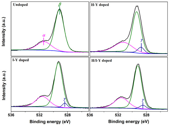 In order to understand the effect of Y-doping on oxygen ions in CeO2 crystals, the O 1s XPS regions of the Undoped CeO2 and H-Y-, I-Y-, and H/I-Y-doped CeO2 were recorded and fitted, as shown in Figure 5. The O 1s XPS spectrum of the Undoped CeO2 was curve-fitted into two peaks: one peak, labeled as α, at ~529.2 eV, could be attributable to the lattice oxygen species; the other peak, labeled as β, at ~531.4 eV, could be attributable to the chemisorbed oxygen species and/or weakly bonded oxygen species related to the oxygen vacancy (VO) defects. For the O 1s spectra of the H-Y-, I-Y-, and H/I-Y-doped CeO2, a new peak labeled as γ, at~528.5 eV, was curve-fitted, which could be assigned to the O-Y species. In addition, the relative oxygen vacancies ratio (labeled as [VO]XPS) could be quantified using Equation (2), and the results are shown in Table 1.