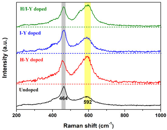 To further investigate the VO defects, Raman spectra of CeO2 were obtained. Raman spectroscopy is a powerful tool for the structural characterization of metal oxides due to its sensitivity to structural changes, such as VO defects. Figure 6 shows the Raman spectra of the Undoped and H-Y-, I-Y-, and H/I-Y-doped CeO2. For the Undoped CeO2, the spectral envelope in the 200~1000 cm−1 range displayed a strong band at 464 cm−1 associated with the triply degenerate F2g vibrational mode of CeO2 [35,36], while the band located at 592 cm−1 was associated with the optical LO mode of substoichiometric CeO2−x units, underscoring an increase in VO defects [37,38]. Upon Y-doping, increases in the intensity of the bands located at 464 and 592 cm−1 were observed for the H-Y-, I-Y-, and H/I-Y-doped CeO2, which were associated with the presence of substoichiometric CeO2-x, underscoring an increase in VO defects. However, the Y3+-doping into the CeO2 lattice increased its lattice distortion and hence interfered with the vibrations of CeO2. Therefore, the Raman band intensities of the Y-doped CeO2 were clearly affected by the incorporation of Y3+ into the CeO2 lattice. Consequently, an alternative approach to estimate the relative concentration of VO defects can be adopted by calculating the ratio of the integrated area of the Raman band at 592 cm−1 to that of 464 cm−1 (labeled [VO]Raman) [39,40]. The values of A592/A464, that is, the relative concentration of oxygen vacancies ([VO]Raman), are shown in Table 1. It can be seen that the [VO]Raman values of the H-Y-, I-Y-, and H/I-Y-doped CeO2 were 1.47, 0.93, and 1.16, respectively, which are higher than that of the undoped sample (0.67).