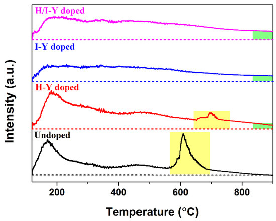 O2-TPD profiles of Undoped and H-Y-, I-Y-, and H/I-Y-doped CeO2 powders.
