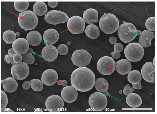 The powder obtained during GA was sieved using a Retsch AS200 sieve shaker (Microtrac Retsch GmbH, Haan, Germany) which allowed us to separate the proper powder fraction for the PBF-LB/M process (20–63 µm). Most powder grains (indicated by red arrows) were characterized by spherical shapes with some satellites (indicated by green arrows), which is visible in Figure 1.