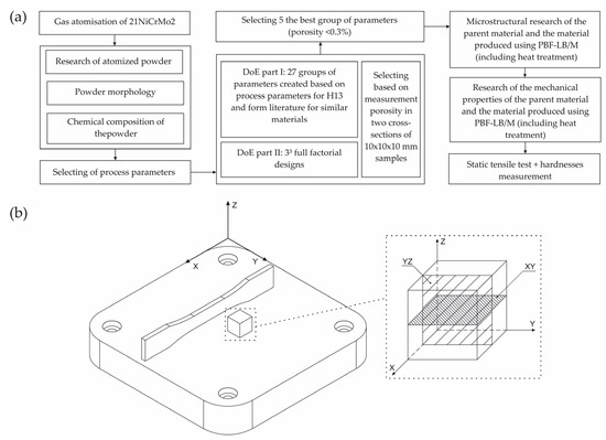 (a) Flowchart of the adopted research methodology and (b) the orientation of samples orientaton in the substrate plate of SLM 125HL (Z—the direction of the layers’ deposition).