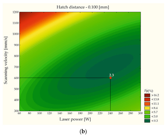The groups of parameters in which the requirement < 0.3% was achieved were characterized by energy densities ranging from 95.2 to 121.2 J/mm3. Additionally, we ben observed that the measured porosity values were different despite reaching similar values of energy density in the given groups. The 1.25, 1.26, and 1.27 parameter groups (Table A1) taken from the available literature [23,27] did not achieve the required porosity regime. Equation (1) was used to estimate porosity values for these cases. As variables, three parameters were considered: x1—laser power, x2—exposure speed, and x3—hatching distance. Using the method of least squares, the coefficients βm and βmn (for m = 1, 2, 3; n = 1, 2, 3) were established. Additionally, by constructing the analysis of the variance table, it was possible to determine the statistical significance and create Equation (3):