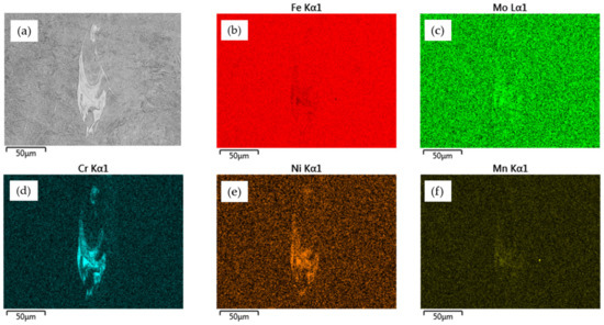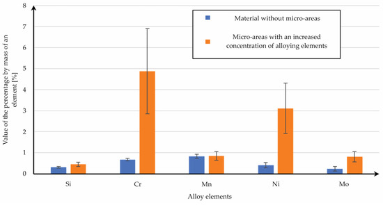 The main alloy elements which were concentrated in the localized micro-areas were chrome, nickel, and molybdenum. The significant value of the standard deviation of the chemical composition analysis (Figure 7) indicates that a meaningful diversity of alloy elements was shared in these structures. The natural after-effect of this phenomenon was a reduction of the share of iron (Figure 6c). There is a need to conduct more detailed analyses of these phenomena in order to identify the reason for the formation of those heterogeneities.
